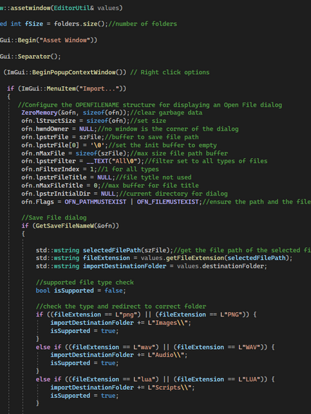 I familiarized myself with the Windows API while working on the asset window and file system. I optimized the procedure for inserting files into the engine directly from the editor. Additionally, I introduced a unique file system approach designed for our small scale, effectively minimizing workload and eradicating time constraints. Having acquired the knowledge, I provided templates for my team to employ in similar code scenarios and offered guidance to ensure seamless implementation.
